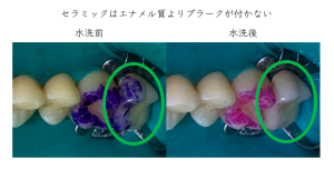 画像は装着後約5年経過した歯です。(隣の歯の治療時に撮影)ある程度時間が経過したセラミックでも、水洗だけでこれだけプラークが落とせるという事は、セルフメンテナンスがとても楽であり、予後も良いという事です。