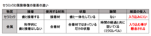その違いを表に表しました。 この表で一番お伝えしたいのは、セラミックは「細菌の侵入リスクが低い」という事です。細菌の侵入リスクが低ければ二次う蝕のリスクも下がるという事ですから、結果生存率が高くなるという事です。