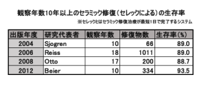 ではまずは「再治療率」について、セレックによるセラミック修復の生存率データをご覧下さい。 ※セレックとは、セラミック修復治療を最短1日で完了させる事のできるシステムです