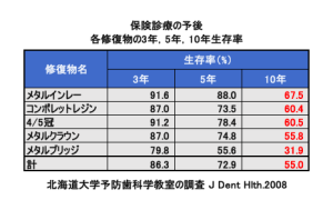 次に、保険診療の修復治療の生存率データをご覧下さい。 このデータは、北海道大学の予防歯科学講座が10年にわたって採取したデータです。